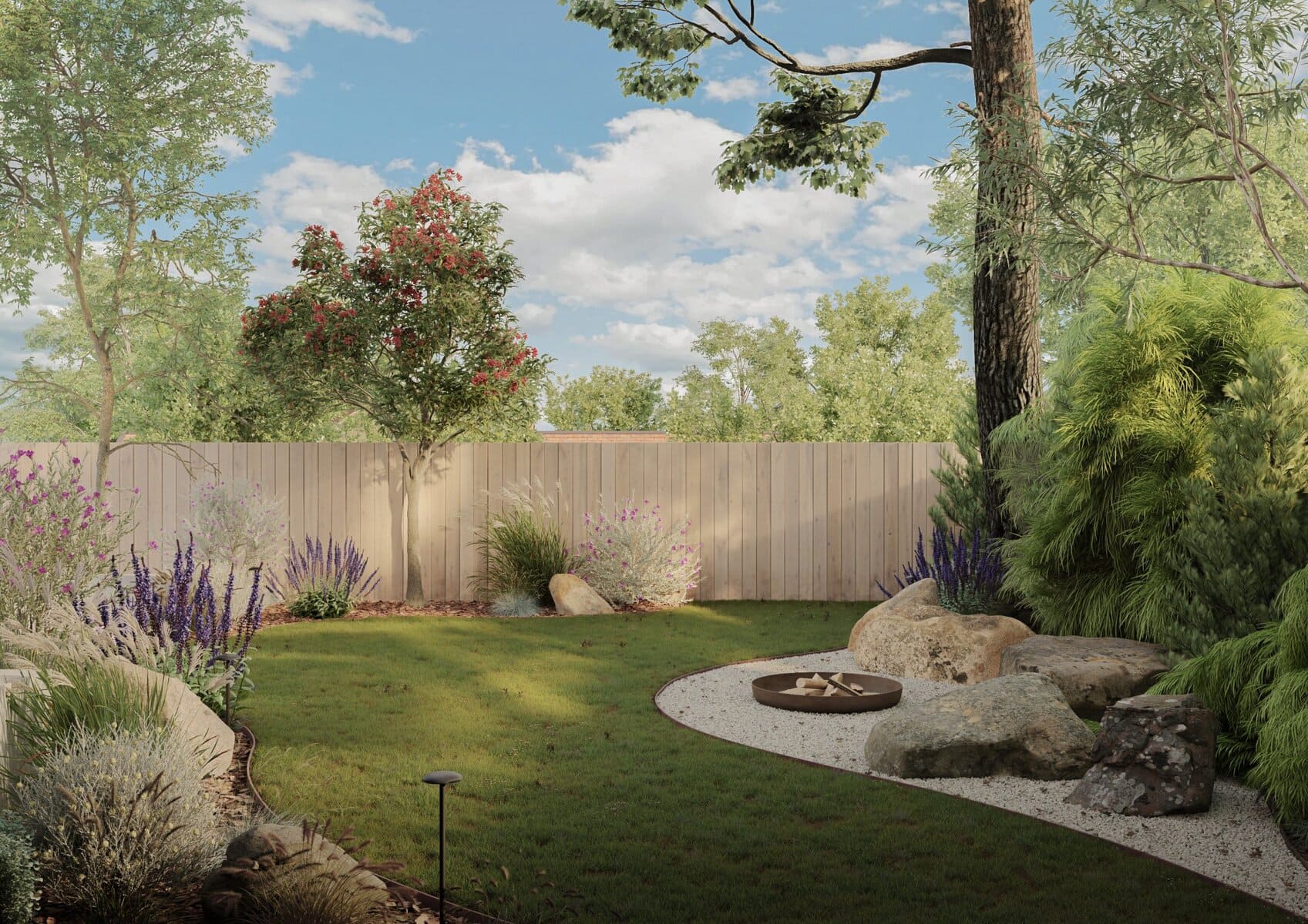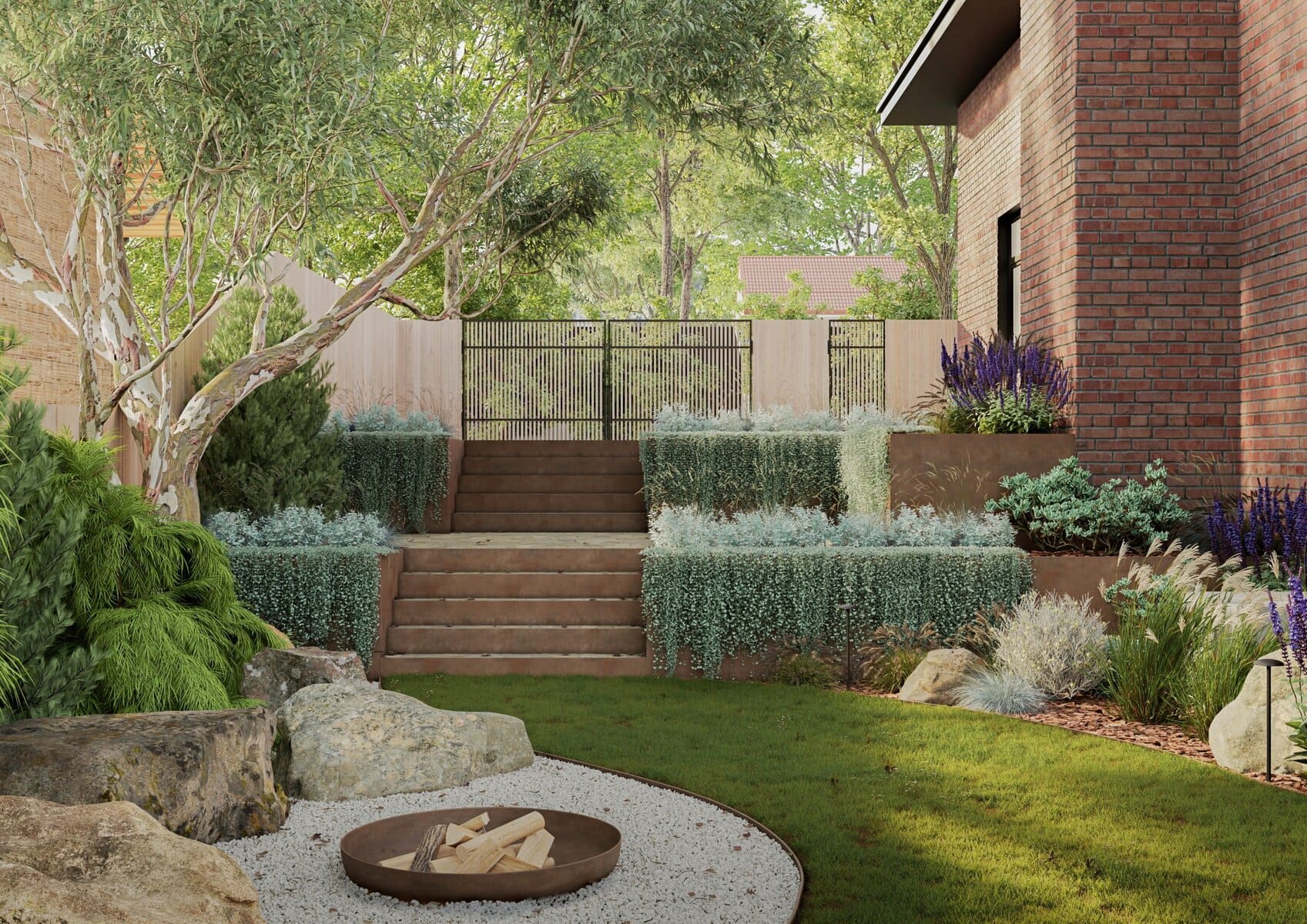 A natural stone fire pit area with boulder seating anchors the lower terrace. Multi-stemmed feature trees preserve bushland character while contemporary timber screening ensures privacy. The design integrates existing mature eucalyptus trees with drought-tolerant native plantings supporting local biodiversity.