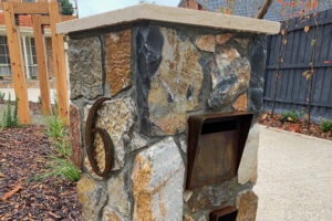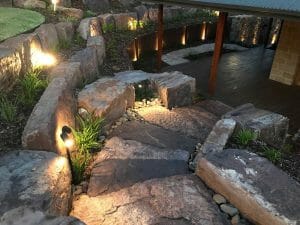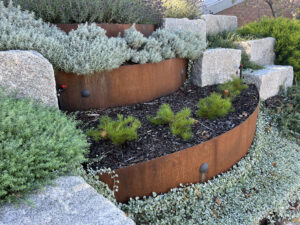A modern home hemmed in with ugly timber sleeper walls was liberated by opening up access to the new garden with rock steps and cladding the walls in feature mild steel and stunning lighting.