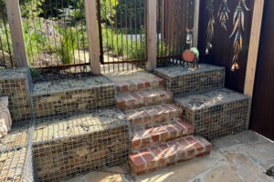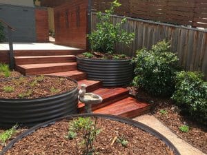 A small garden space with difficult access is reclaimed with the paved courtyard, privacy screening and timber steps which cascade down through the raised garden beds.