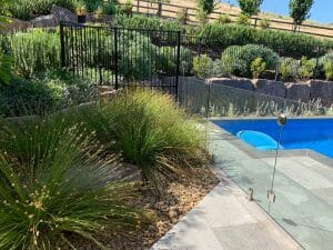 A total transformation on this very steep site from a rocky quarry-like area to extensive lawns, pool with mudstone boulders and steps leading up to adjacent parkland and views to the bay.